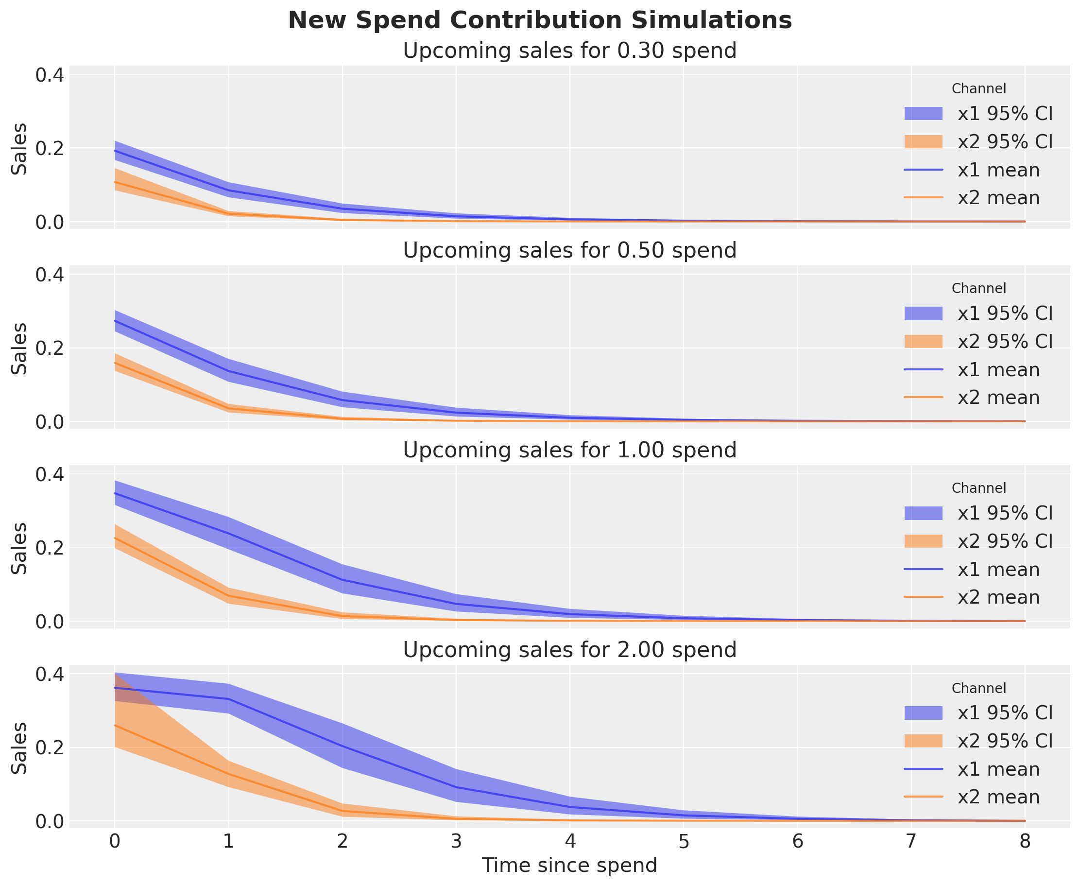 We clearly see that since \(x_1\) has a higher adstock parameter \(\alpha\) than \(x_2\), then for new spend on a single date (i.e. one_time)